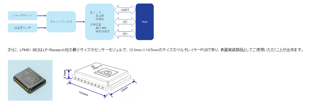 ジャイロスコープ、加速度センサ、磁気センサの情報を独自のアルゴリズムにより精度高く検出・測定するモジュールユニットの開発・生産を行うと共に、そのモジュールを搭載した制御システムを開発しております。今回は、UART / I2C / SPI I/Fを持つ小型6軸慣性計測・姿勢計測ユニットLPMS-BE2をご紹介いたします。