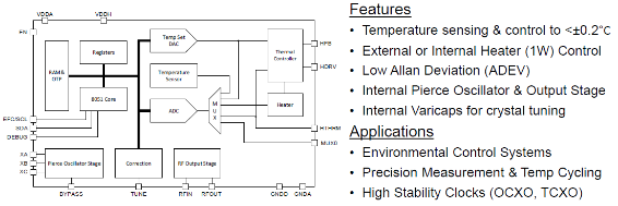 広い温度範囲で高い周波数安定度を求められるTCXO, OCXOに向けて開発されたヒーター内臓、温度センサーとCPU 8051をワンチップに搭載した温度制御用ICです。