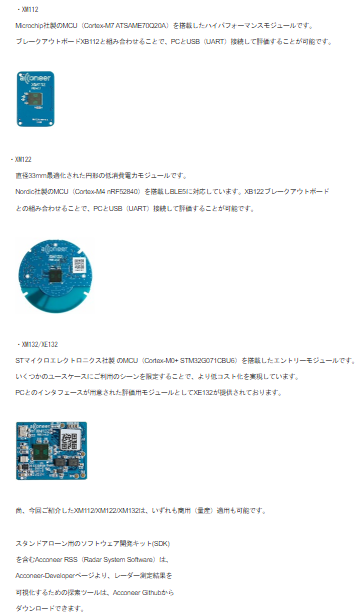 A111を搭載しているミリ波レーダモジュールとしてXM112/XM122/XM132がラインナップされております。最新FWでは、液体レベルの測定や物体検知・距離測定に最適なEnvelope Service、人感センサーに最適なSparse Serviceとも、最大検出距離が12.4mになるなど、大きな改善がされています。